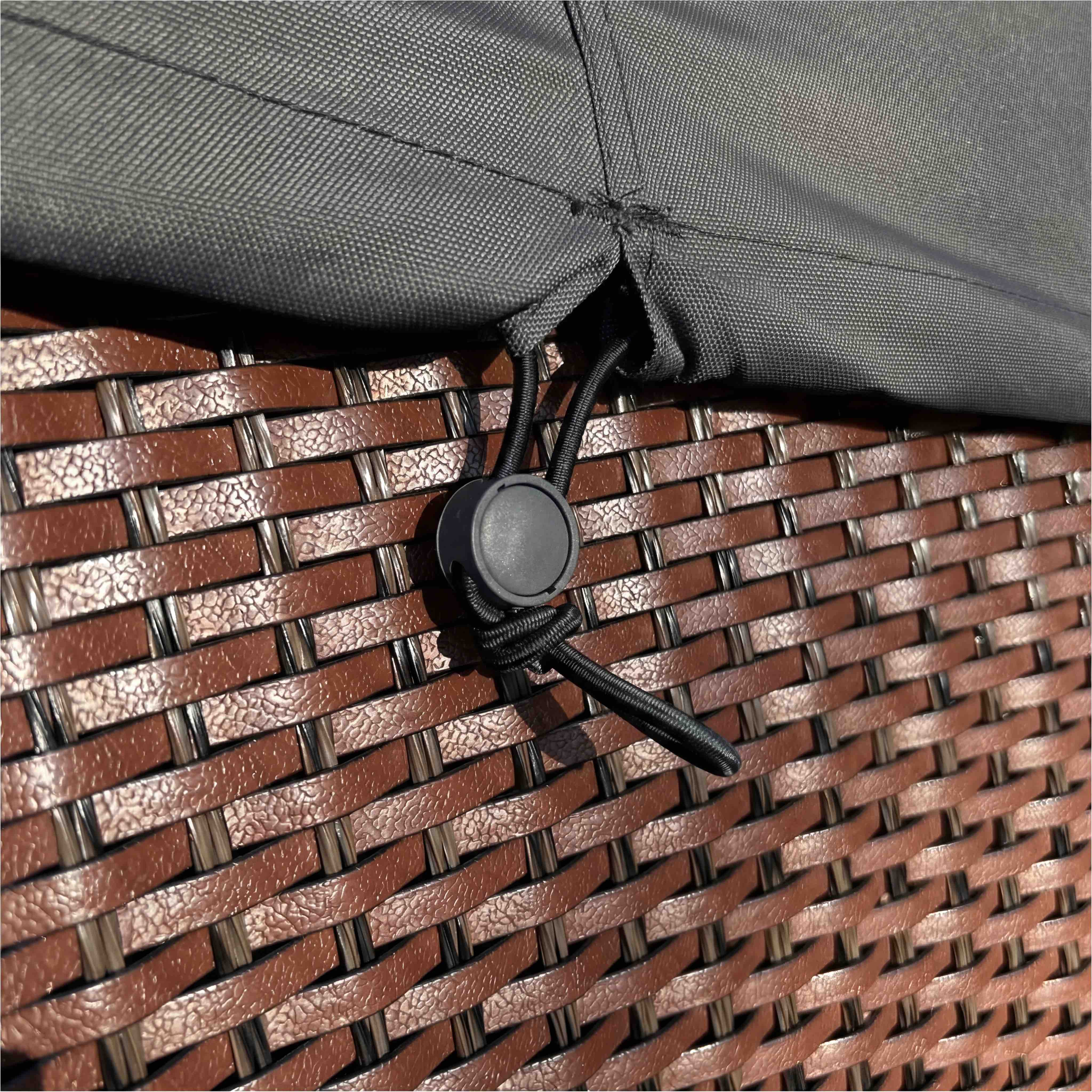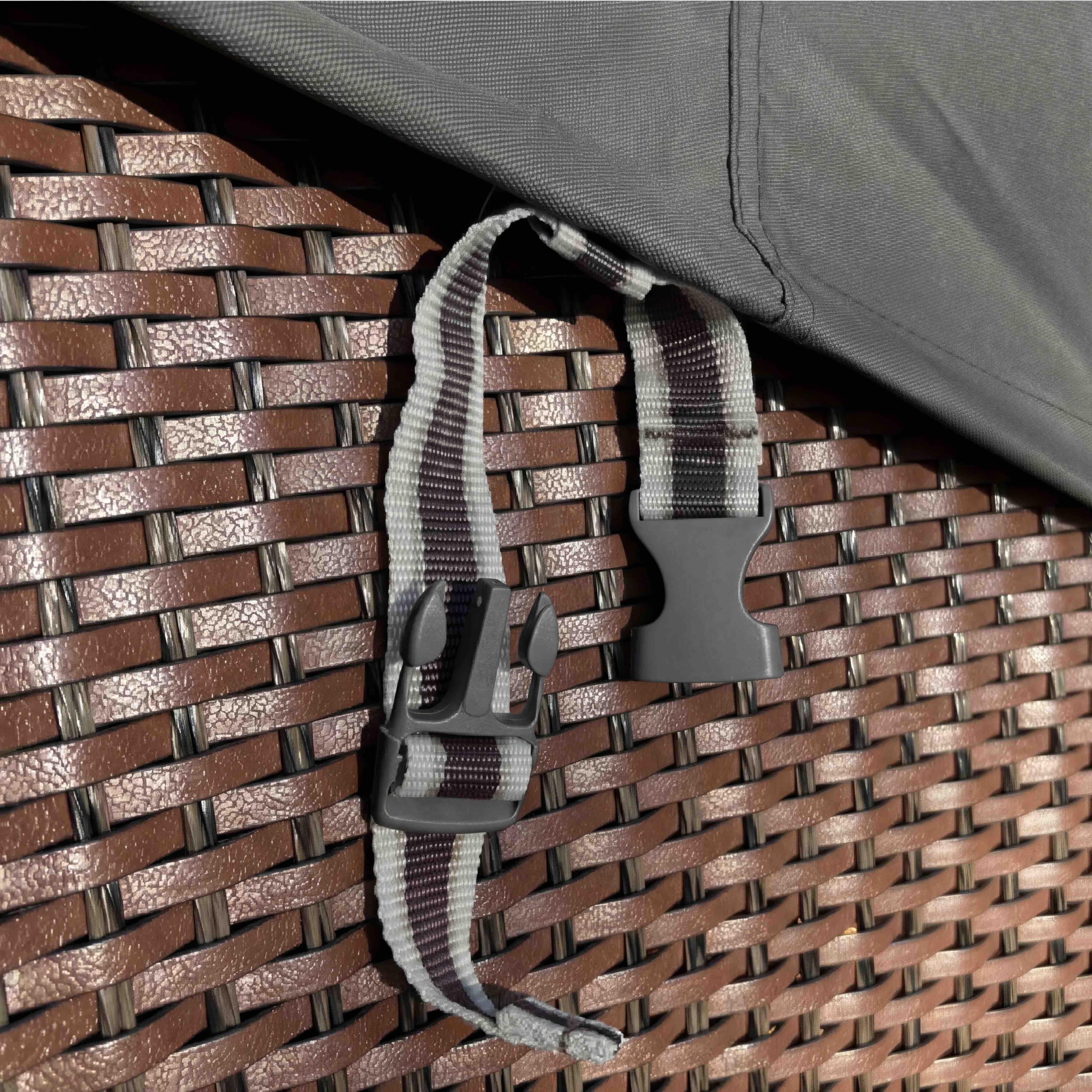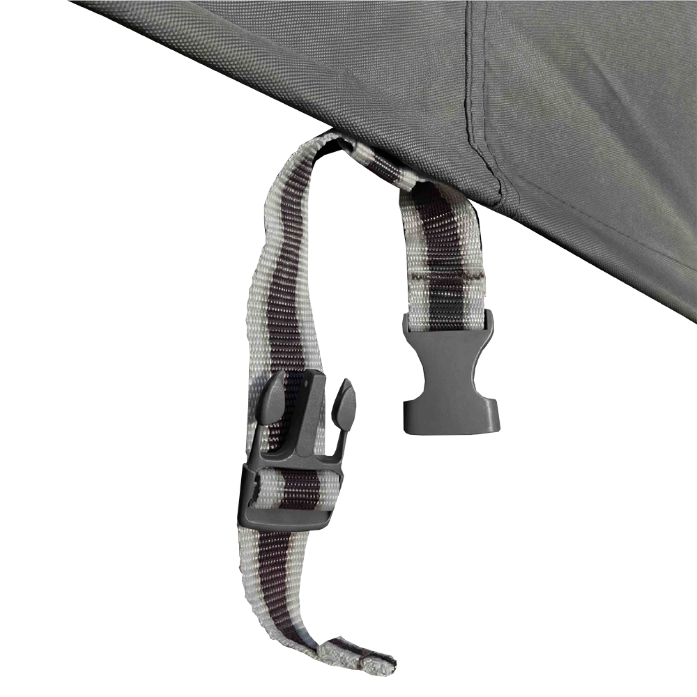 - Click-close tension strap to secure the cover to a leg or frame and prevent it from blowing off