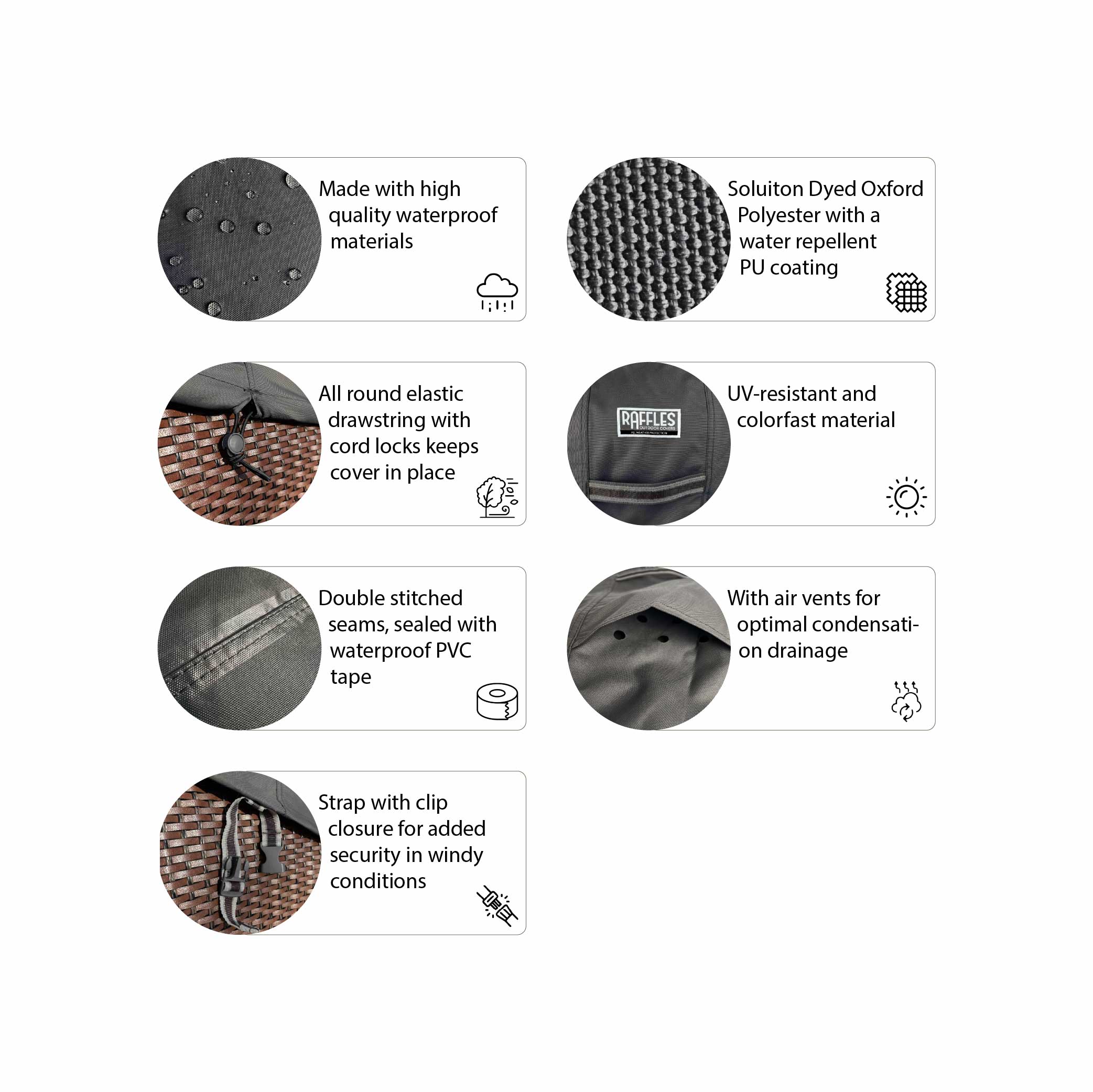The double-stitched seams are finished on the inside with waterproof PU tape, making them extra strong and splashproof. Integrated Airvents (ventilation openings) ensure constant air circulation inside the cover. This limits condensation and helps to prevent mould, mildew, rust and corrosion, so your chairs stay looking good for longer.