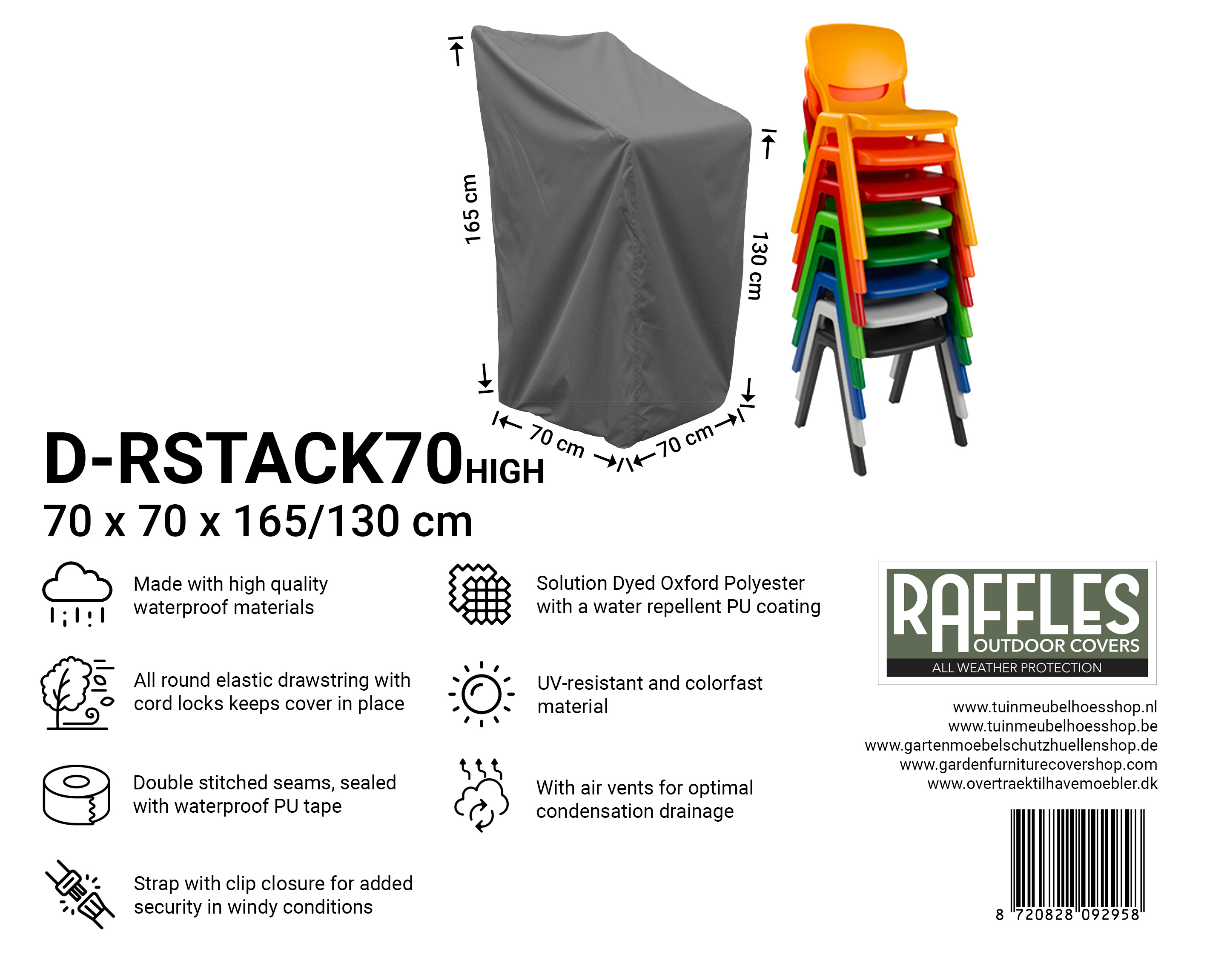 With the RSTACK series stacking chair covers from Raffles Covers you can protect several stacking chairs at once against the weather and dirt. Whether you have a compact stack of 4 chairs or a higher stack of up to approx. 8 chairs, there is always a suitable cover that protects your chairs against rain, sun, snow, dirt, green deposits and bird droppings.