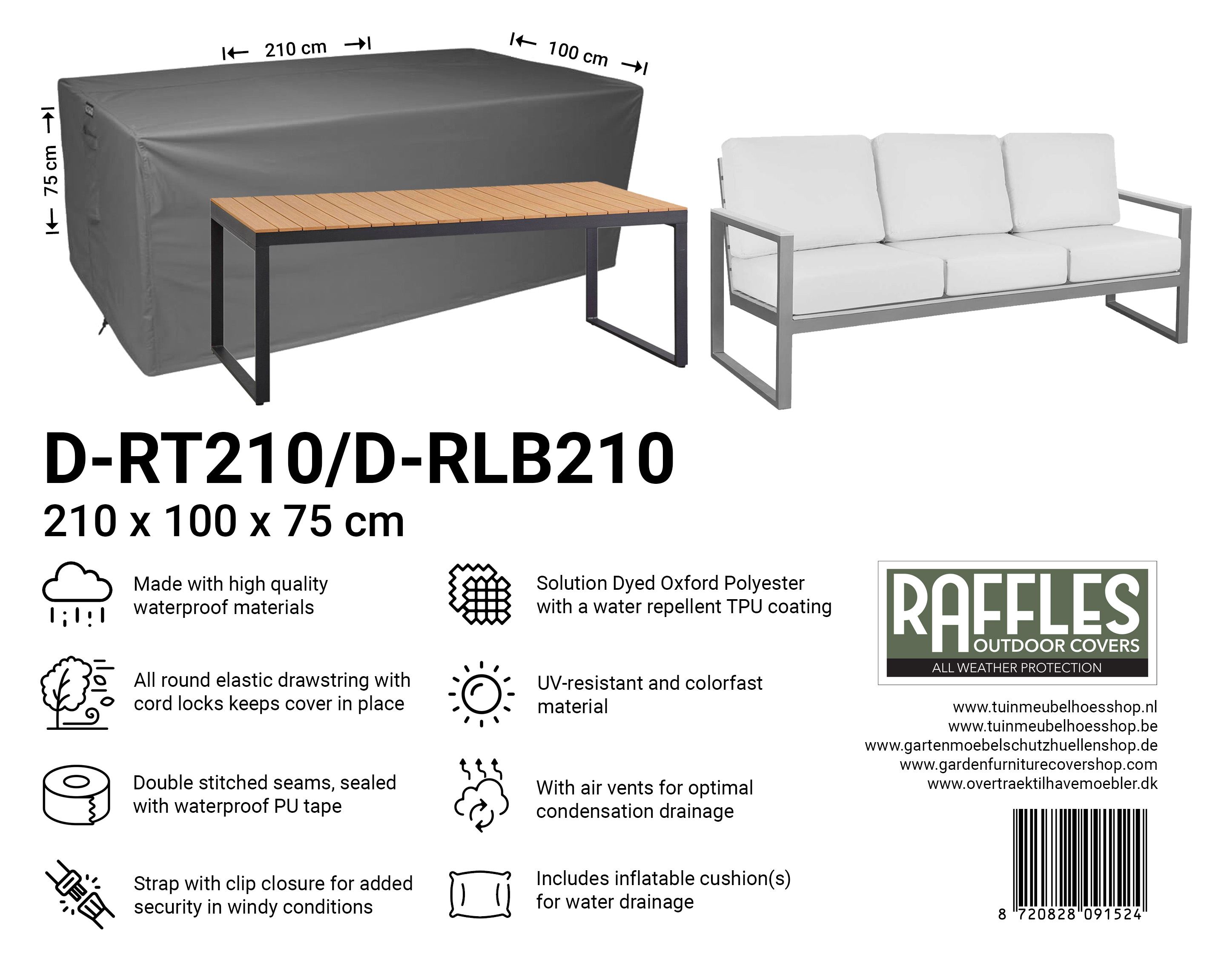With the RT series garden table covers from Raffles Covers you can protect your garden table(s) all year round against rain, sun, dirt, green deposits, bird droppings and UV radiation. Whether you have a compact bistro table, a standard rectangular garden table or an extra-long XXL table, there is always a suitable cover so your table stays clean and is immediately ready for use.