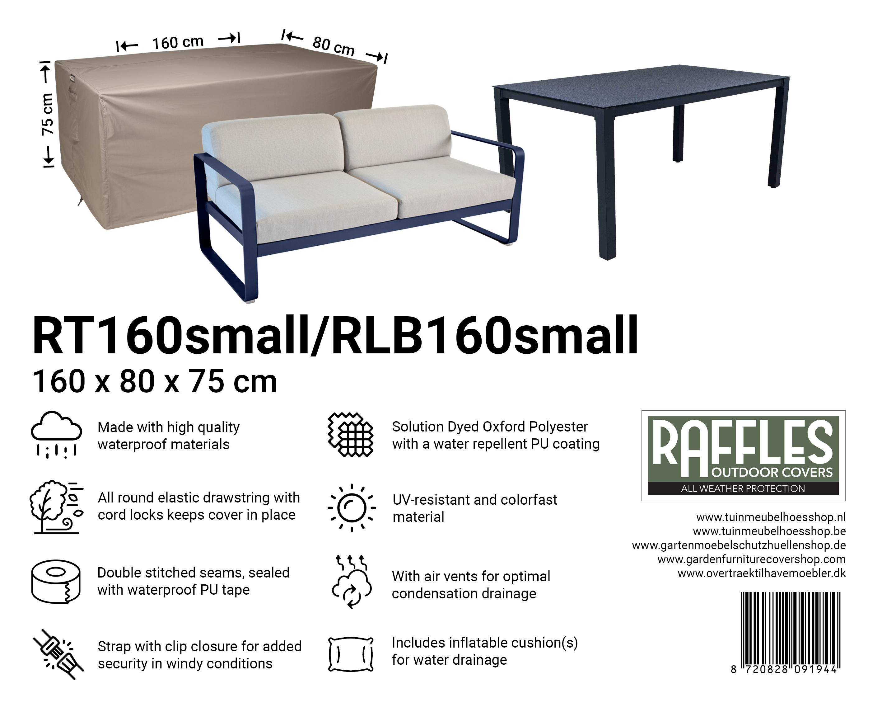 With the RT series garden table covers from Raffles Covers you can protect your garden table(s) all year round against rain, sun, dirt, green deposits, bird droppings and UV radiation. Whether you have a compact bistro table, a standard rectangular garden table or an extra-long XXL table, there is always a suitable cover so your table stays clean and is immediately ready for use.
