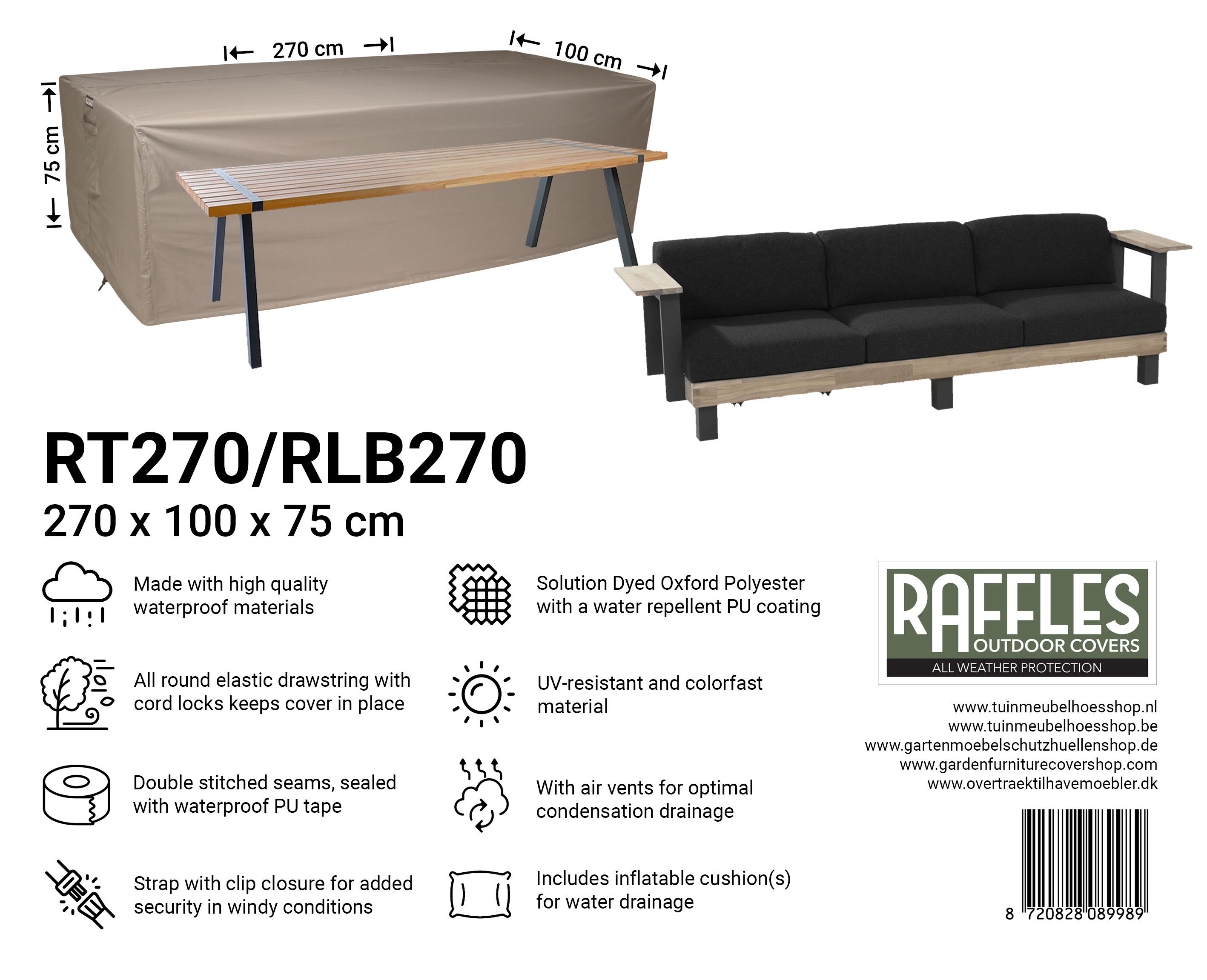 With the RT series garden table covers from Raffles Covers you can protect your garden table(s) all year round against rain, sun, dirt, green deposits, bird droppings and UV radiation. Whether you have a compact bistro table, a standard rectangular garden table or an extra-long XXL table, there is always a suitable cover so your table stays clean and is immediately ready for use.