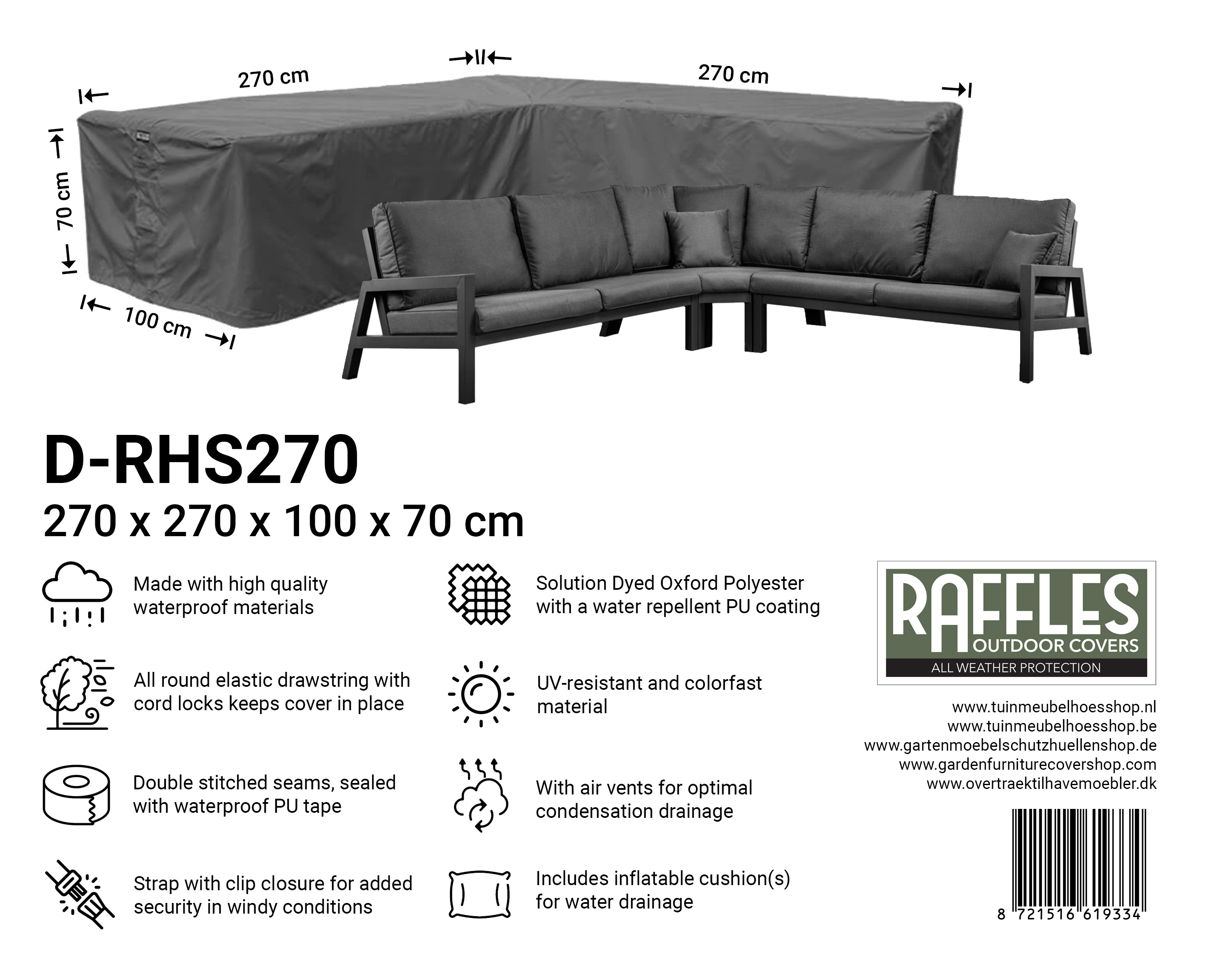 With the RHS Series corner sofa covers by Raffles Covers, you can protect your lounge corner sofa or L-shaped lounge set, from compact to XXL, all year round. Whether your corner sofa is placed on the patio, balcony, under a canopy or out in the garden, your lounge set stays protected against rain, dirt, green deposits and sunlight.