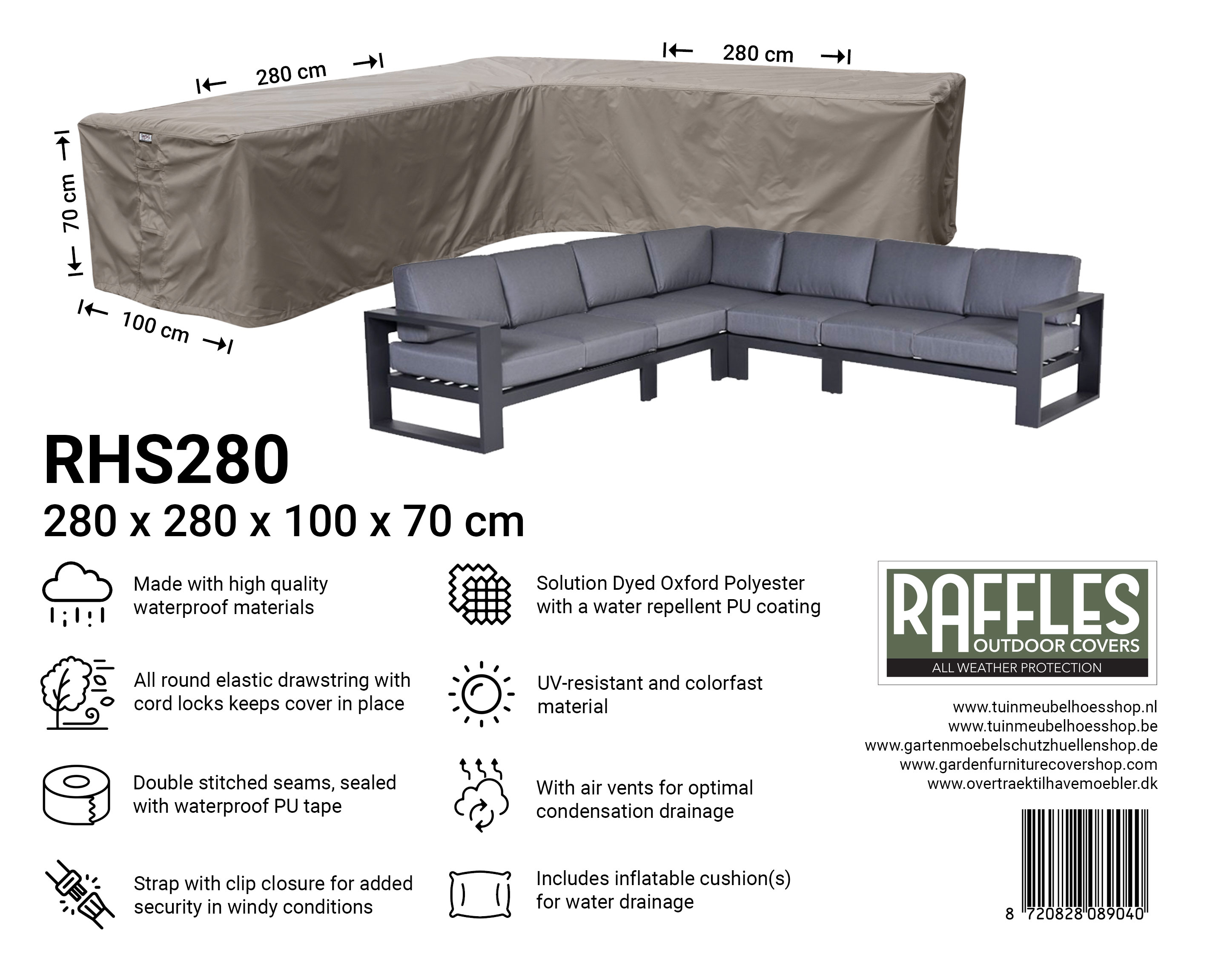 With the RHS Series corner sofa covers by Raffles Covers, you can protect your lounge corner sofa or L-shaped lounge set, from compact to XXL, all year round. Whether your corner sofa is placed on the patio, balcony, under a canopy or out in the garden, your lounge set stays protected against rain, dirt, green deposits and sunlight.