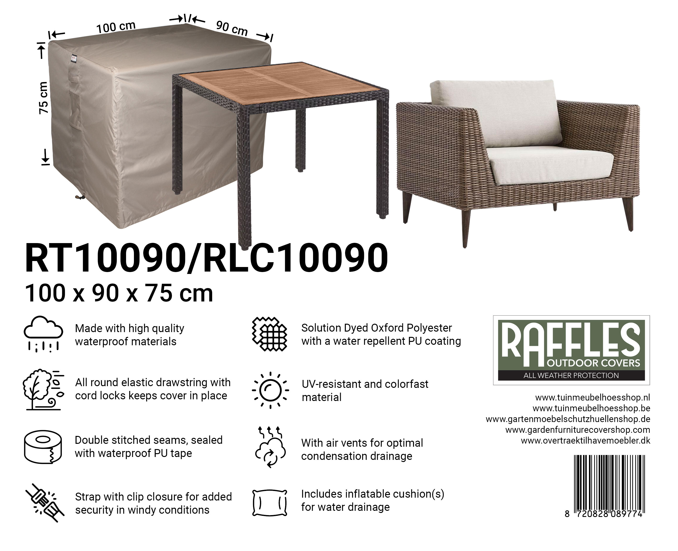With the RLC series lounge chair covers from Raffles Covers, you can protect your lounge chair, armchair or compact loveseat all year round against rain, wind, dirt, green deposits and sunlight. Whether your chair is on the patio, balcony, under a canopy or free-standing in the garden: with this cover your lounge chair stays clean, dry and ready for use at any time.