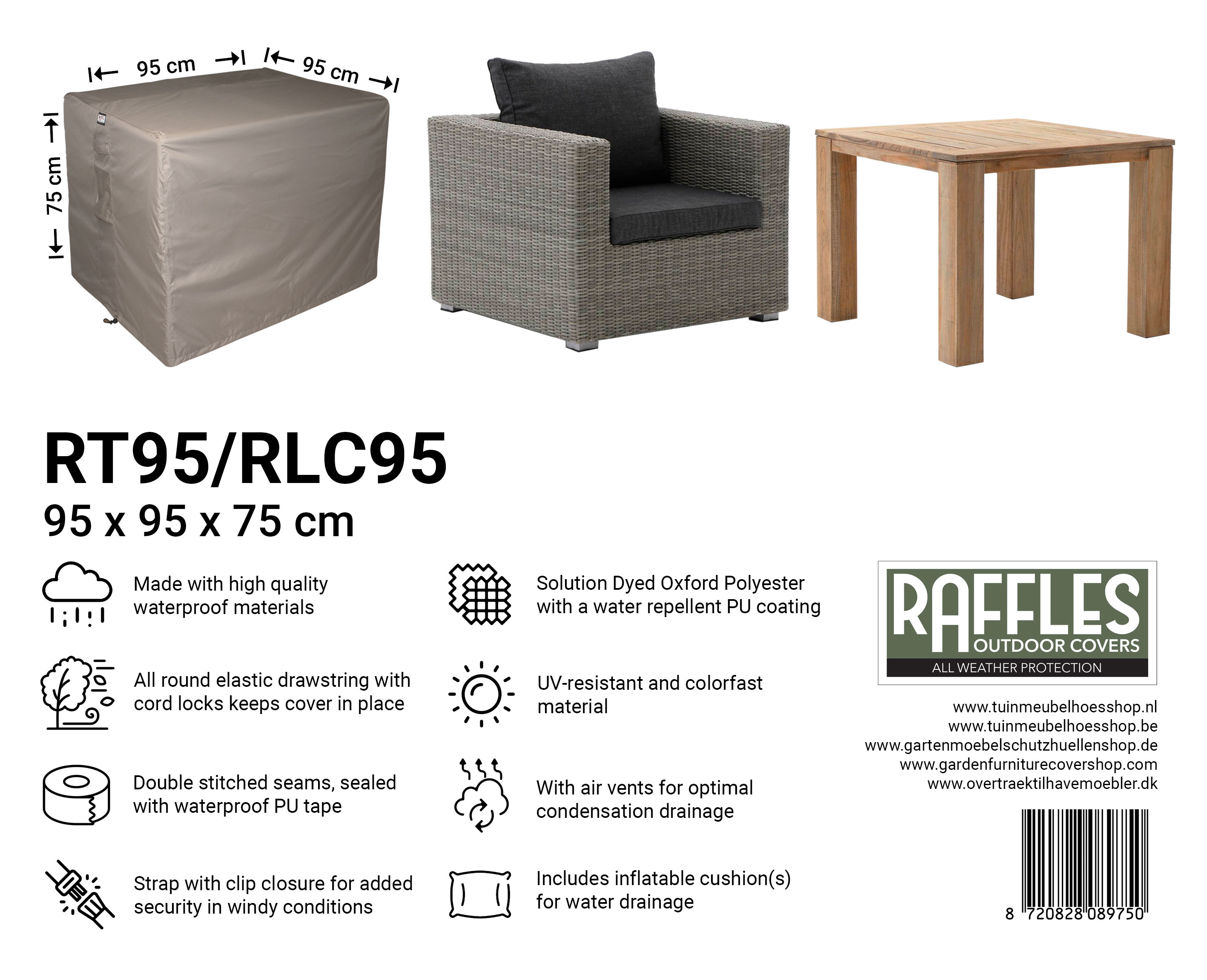 With the RLC series lounge chair covers from Raffles Covers, you can protect your lounge chair, armchair or compact loveseat all year round against rain, wind, dirt, green deposits and sunlight. Whether your chair is on the patio, balcony, under a canopy or free-standing in the garden: with this cover your lounge chair stays clean, dry and ready for use at any time.